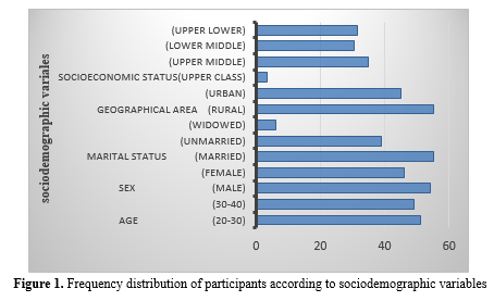 Figure 1 depicts the distribution of participants by demographic variable, highlighting the dominance of specific categories. It demonstrates that most participants were from rural areas, aged 20-30, married, and belonged to the upper middle class. Furthermore, males were slightly more prevalent (45) compared to females (40).