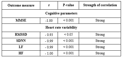 depicts correlations between HAM-D (Hamilton Depression Rating Scale) scores and physiological and cognitive measures. The Mini-Mental State Examination (MMSE) scores and HAM-D scores have a perfect negative association (r = -1.00, p < 0.001), which suggests that with an increase in depression severity, cognitive performance decreases as assessed by the MMSE. Similarly, there was a strong negative correlation between HAM-D scores and the following variables: LF (r = -0.99, p < 0.001), SDNN (r = -0.99, p < 0.01), RMSSD (r = -0.93, p < 0.01), and mean heart rate (r = -0.99, p < 0.001). These results indicate that lower heart rate variability, as seen by lower RMSSD, SDNN, and LF values, as well as a lower mean heart rate, are linked to higher depression scores. On the other hand, there was a highly significant and negative correlation (r = -1.00, p < 0.001) between HAM-D scores and HF (High-frequency power), which highlights the effect of depression on autonomic nervous system function.