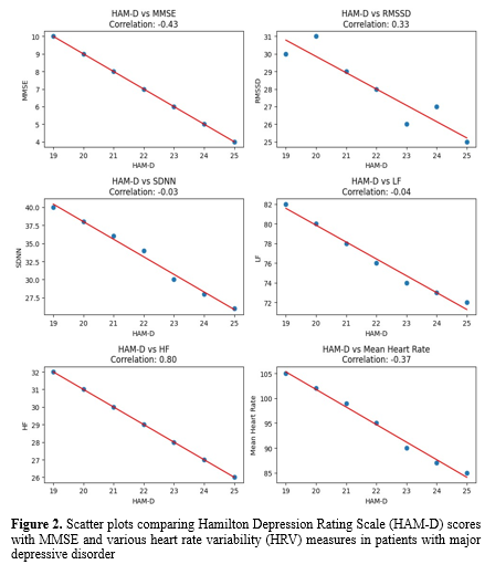 In this study, we discovered a positive correlation between greater feelings of depression and increased parasympathetic activation. We found a significant negative connection between HAM-D scores, heart rate, and Mini-Mental State Examination (MMSE) scores, suggesting that severe depressive symptoms are associated with lower heart rates and poorer cognitive function. These findings show the complex and multidimensional links between depressive symptoms, autonomic function, and cognitive performance, emphasizing the need for a comprehensive approach to understanding and treating major depression. HRV can be considered an essential potential biomarker to assess cardiovascular health in the early stages of life.