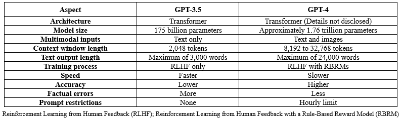 Table 1. Comparison of GPT-3.5 and GPT-4 across various parameters
